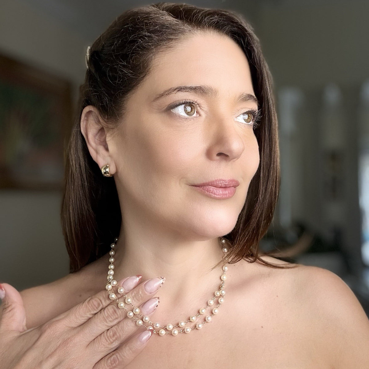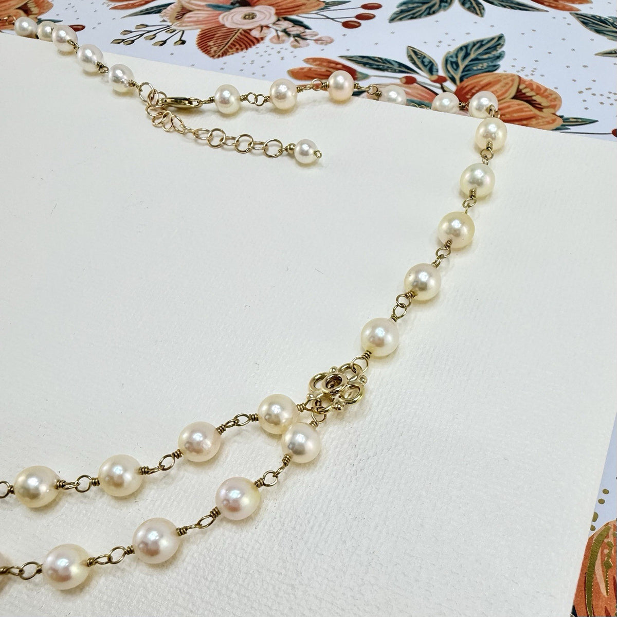 This 14k Yellow Gold Akoya Cultured Pearl Handcrafted Necklace features 48pc of beautiful, approx. 5.5-6mm, cream-rose pearls measuring approx. 5.5-6.5mm. The main focal point of the necklace consists of 2pcs of decorative, flower-like, 14k gold links attached to a double row of pearl handcrafted chain. The necklace is crafted using high-quality, 14k gold wire, and has a romantic, beaded style. The use of yellow gold adds a touch of warmth and elegance to the piece, making it a versatile and eye-catching addition to any jewelry collection. This necklace is adjustable from 17"-18.75" and has a lobster claw clasp, it weighs 18.1 grams.Newly handcrafted necklace.This beautiful necklace will ship in a jewelry gift box.For a video, check out our Instagram account my_bejeweled_life
