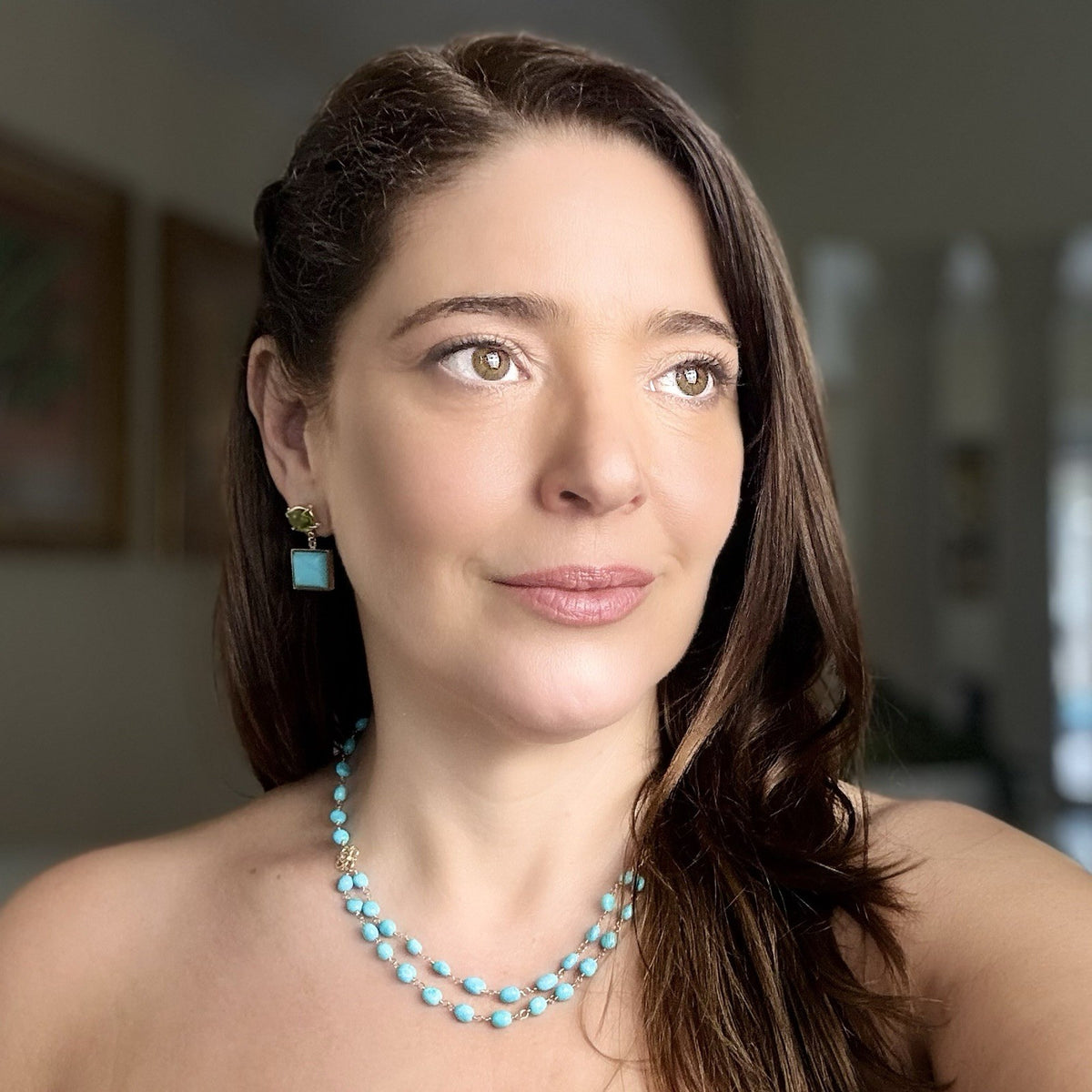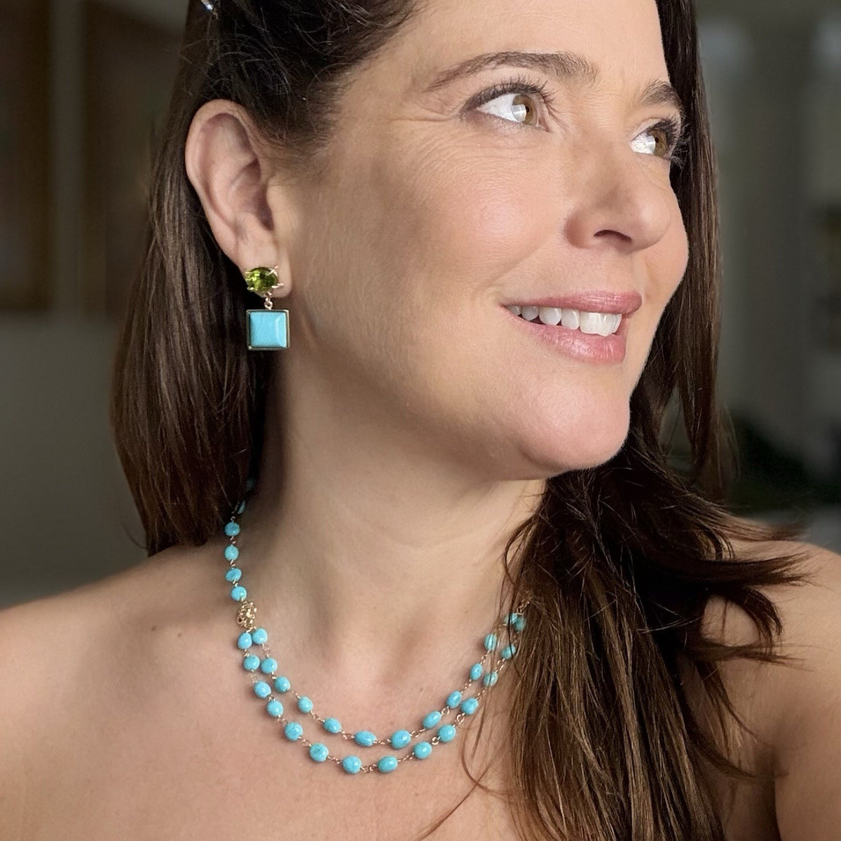 This 14k Yellow Gold Genuine Sleeping Beauty Turquoise Handcrafted Necklace features 47pc of beautiful, blue turquoise gemstones measuring approx. 5.5x6.5mm. The main focal point of the necklace consists of 2pcs of decorative, flower-like, 14k gold links attached to a double row of turquoise handcrafted chain. The necklace is crafted using high-quality, 14k gold wire, and has a romantic, beaded style. The use of yellow gold adds a touch of warmth and elegance to the piece, making it a versatile and eye-catching addition to any jewelry collection. This necklace is adjustable from 16.5"-18" and has a lobster claw clasp, it weighs 13.5 grams.Newly handcrafted necklace.This beautiful necklace will ship in a jewelry gift box.For a video, check out our Instagram account my_bejeweled_life