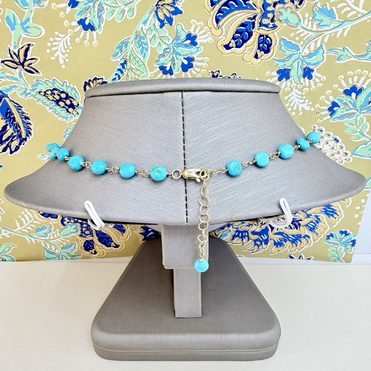 This 14k Yellow Gold Genuine Sleeping Beauty Turquoise Handcrafted Necklace features 47pc of beautiful, blue turquoise gemstones measuring approx. 5.5x6.5mm. The main focal point of the necklace consists of 2pcs of decorative, flower-like, 14k gold links attached to a double row of turquoise handcrafted chain. The necklace is crafted using high-quality, 14k gold wire, and has a romantic, beaded style. The use of yellow gold adds a touch of warmth and elegance to the piece, making it a versatile and eye-catching addition to any jewelry collection. This necklace is adjustable from 16.5"-18" and has a lobster claw clasp, it weighs 13.5 grams.